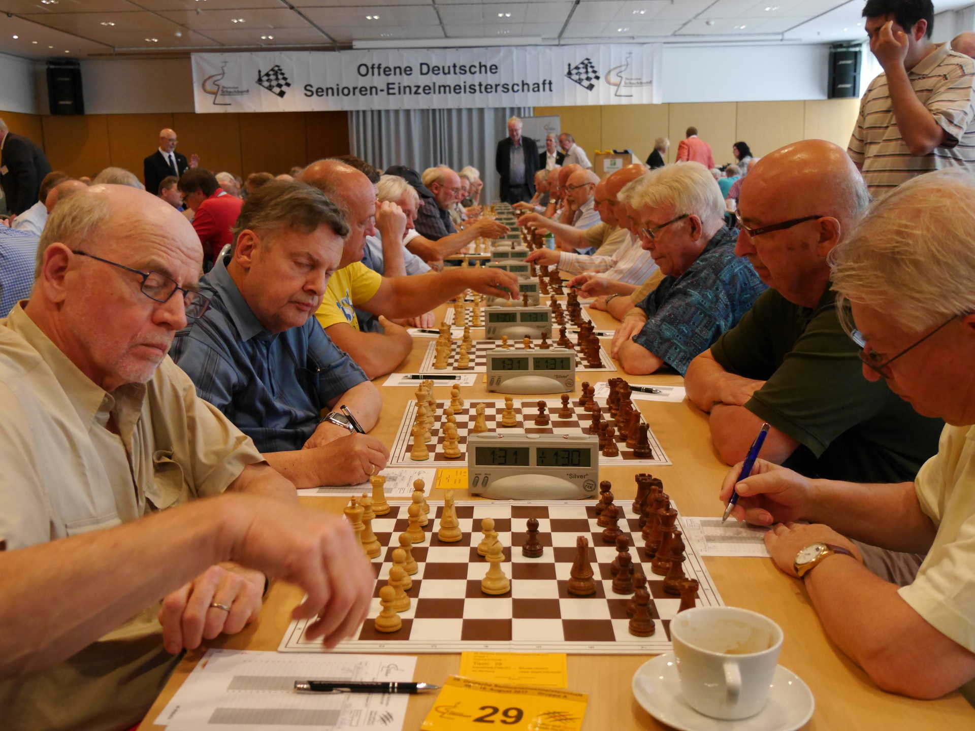 In Berlin startete heute die 29. Deutsche Senioreneinzelmeisterschaft im Holiday Inn in der Berliner City West. In der Gruppe A nehmen 143 Männer und 5 Frauen den Kampf um die Meistertitel der Senioren auf.